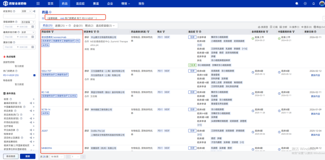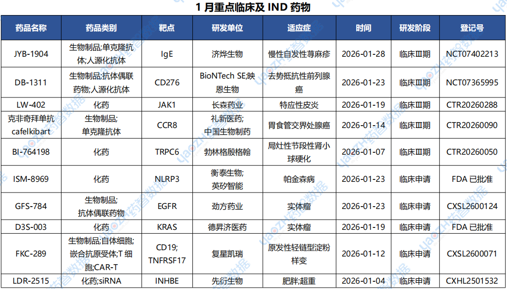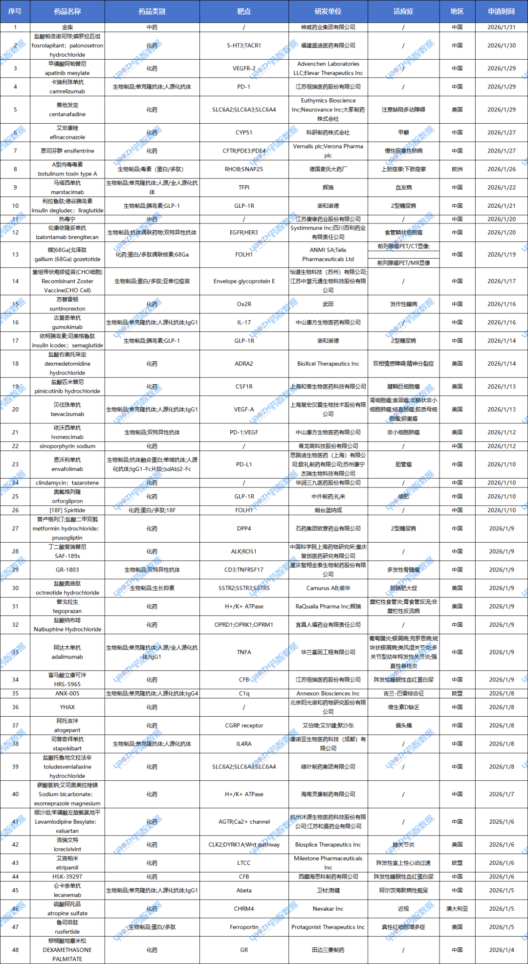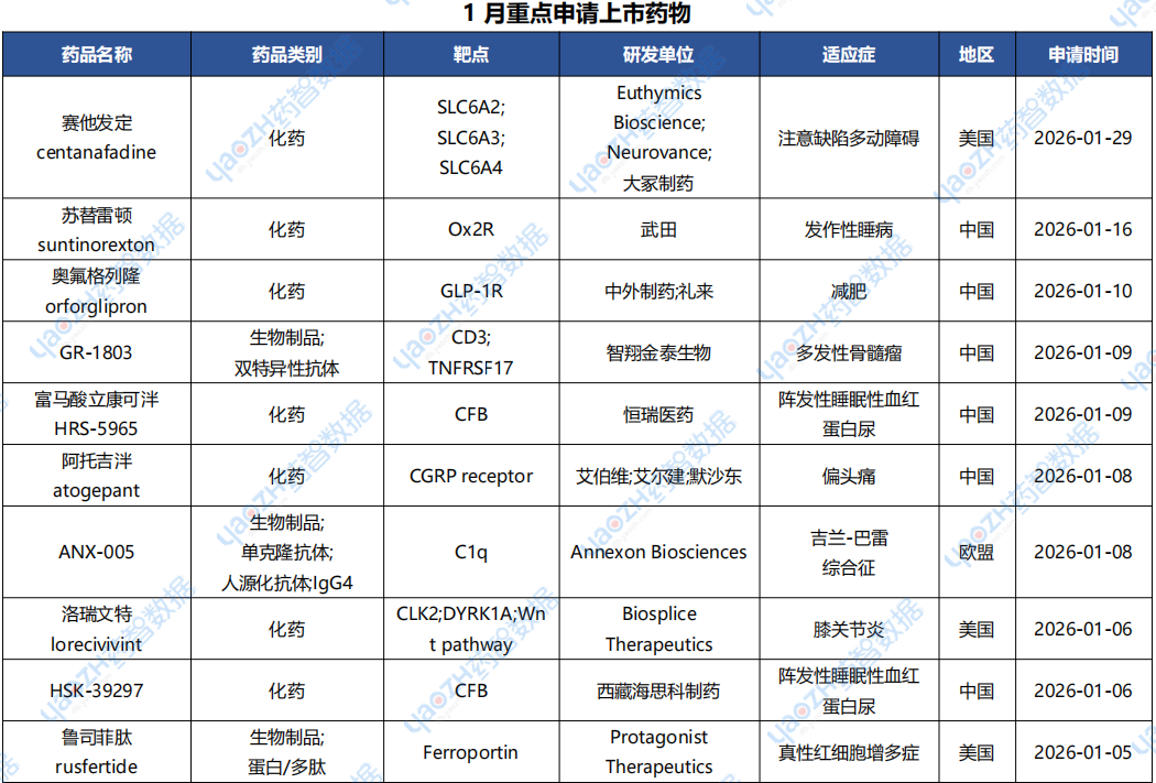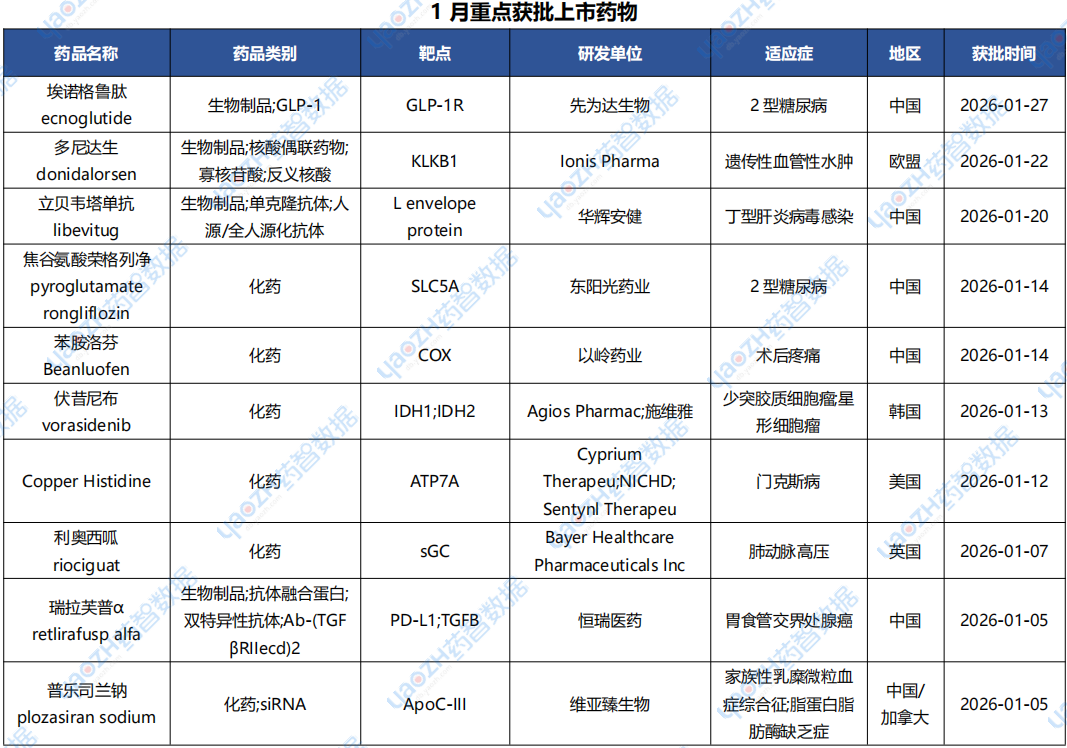 据全球药物分析系统数据库统计,1月全球共65款新药获批上市(包括新获批适应症),其中境外36个上市药品,中国境内30个药品(含一个药品多个地区上市),下表展示部分重点上市药物,文末附完整清单,更多药品信息可通过全球药物分析系统进行查看。2026年1月12日,美国FDA批准Copper Histidine(Zycubo)注射液作为首个用于治疗儿童Menkes病(门克斯病)的药物。这是全球首个用于治疗门克斯病儿科患者的疗法,填补了数十年来新生儿和儿童门克斯病治疗领域的空白。2026年1月20日,国家药品监督管理局(NMPA)附条件批准华辉安健生物科技有限公司申报的立贝韦塔单抗注射液(HH-003/Libevitug/华优诺)上市,用于治疗伴有或不伴有代偿期肝硬化的慢性丁型肝炎病毒(HDV)感染成年患者。立贝韦塔单抗是病毒性肝炎治疗领域的突破性成果,是该领域全球首个获批的抗体类药物,也是中国首个丁肝治疗药物,填补国内该领域治疗空白,已分别获得CDE和FDA的突破性疗法认定。据全球药物分析系统数据库统计,1月全球共48款药物申请上市(包括首次申请和新申请),下表展示部分重点申请上市药物,文末附完整清单,更多药品信息可通过全球药物分析系统进行查看。2026年1月10日,礼来的小分子口服GLP-1R激动剂奥氟格列隆(Orforglipron)在华申报上市。此前,该药物在2025年11月已经获得FDA颁发的国家优先凭证,且在2025年12月18日向FDA递交该药物用于减肥的上市申请。Orforglipron作为全球最接近上市的口服小分子GLP-1药物,在中美陆续申报上市,有望为广大患者带来更多选择,Orforglipron有巨大的市场机会,预计全球峰值销售额将达147亿美元。据全球药物分析系统数据库统计,2026年1月首次进入重点临床试验(三期)的新药项目有35个,临床申请有132个,下表展示部分重点信息,完整信息可通过全球药物分析系统进行查看。2026年1月23日,据CDE官网公示,劲方医药申报的“注射用GFS784”临床试验申请获受理(受理号:CXSL2600124)。这是一款EGFR-Pan RAS ADC药物,这也是全球首款进行临床申请的RAS ADC药物。3.1 56亿美元!荣昌生物PD1/VEGF双抗出海据全球药物分析系统统计,在热门双靶点PD-1+VEGF赛道中,全球目前共有25个在研药物,主要是由中国企业在引领这一赛道,其中包括荣昌生物在内的还有普米斯、宜明昂科(已终止授权交易)、礼新生物、三生制药均有出海交易,本土新势力正千帆竞发,开启自己的“大航海时代”。在2026年1月12日,康方生物海外合作伙伴Summit Therapeutics透露,它已向FDA递交了PD-1/VEGF双抗Ivonescimab(依沃西)的上市申请,有望2026年内成功出线,属于国产PD-(L)1/VEGF双抗的全球化未来,正在徐徐展开。图片来源:药智数据-全球药物分析系统