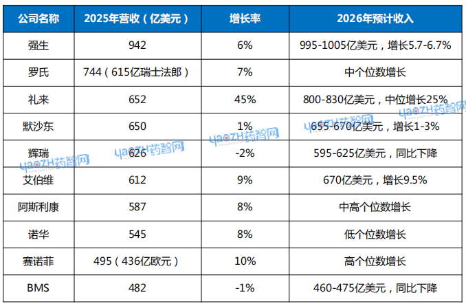 强生堪称稳健增长的范例,其2025年收入942亿美元,增长6%,预计2026年收入将达到1000亿美元,稳居全球药企营收榜首。
